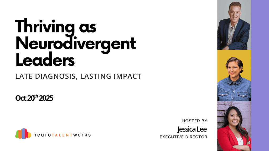Guided by Jessica Lee, Co-Founder and Executive Director of NeuroTalent Works, the conversation will cover how neurodivergent leaders balance work and life, advocate for their strengths, address challenges with authenticity, and lead inclusive teams. Join us to hear personal stories, practical strategies, and insight for embracing neurodivergence in leadership and beyond.